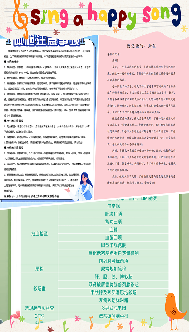 我們深知,員工的幸福與家庭息息相關(guān),而父親的健康更是全家人的牽掛。為此,言赫精心定制了專業(yè)、全面的健康體檢套餐,涵蓋心腦血管、肝功能、腎功能、甲狀腺、腫瘤篩查、血糖血脂等關(guān)鍵項(xiàng)目,我們希望通過(guò)這份貼心的健康禮包,幫助父親們及早發(fā)現(xiàn)潛在風(fēng)險(xiǎn),防患于未然,用科學(xué)的方式守護(hù)他們的安康,讓每一位父親都能以更健康的體魄,享受天倫之樂(lè)。